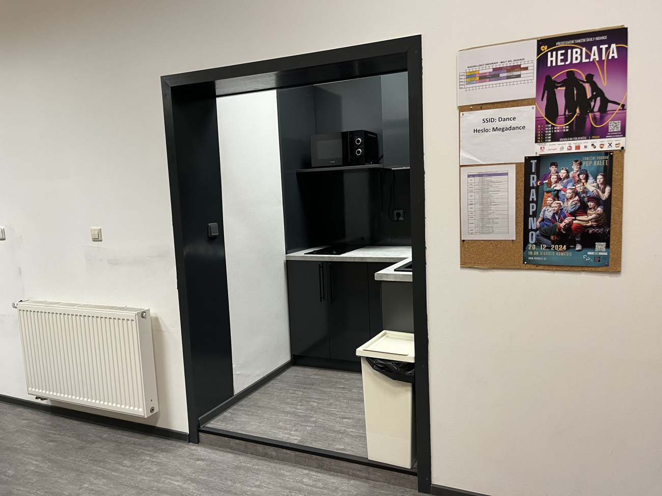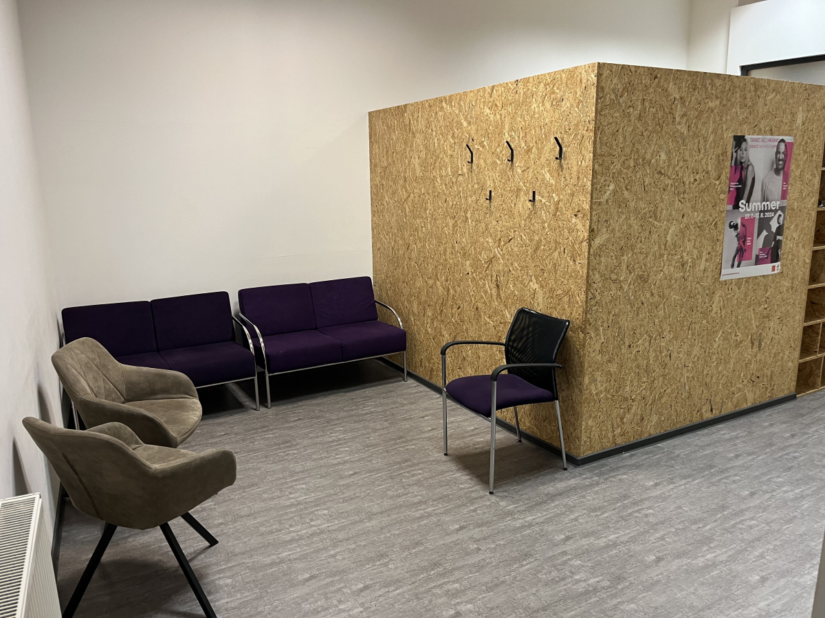 U šaten malého sálu na Vinohradech je pro tyto účely připravená kuchyňka, která bude stále doplňována. K dispozici je instantní káva a několik druhů čaje.